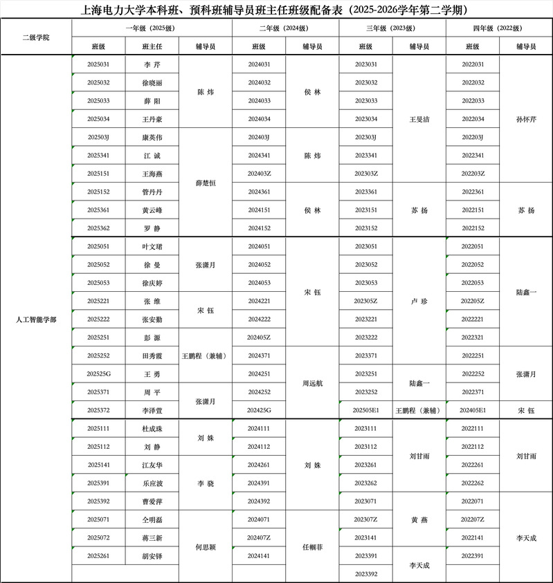 304永利集团本科班、预科班辅导员班主任班级配备表(2025-2026学年第二学期)