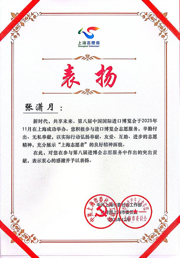 三月春风暖,雷锋精神传。正值全国上下深入开展“雷锋月”活动、大力弘扬“奉献、友爱、互助、进步”志愿精神之际,我校志愿服务工作再传捷报。近日,中共上海市委社会工作部、共青团上海市委发布了《关于通报表扬第八届中国国际进口博览会优秀志愿者和志愿服务先进集体的决定》,304永利集团教师张潇月获评“第八届中国国际进口博览会优秀志愿者”,以实际行动践行使命,在进博会的大舞台上生动诠释了新时代雷锋精神的内涵。